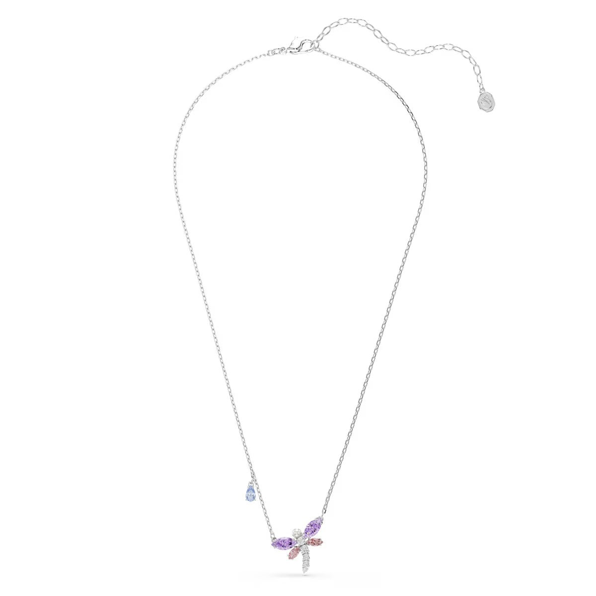 A symbol of transformation, this evocative dragonfly pendant is worn on a delicate chain and features a central motif that is rhodium plated and paved in clear Swarovski Zirconia. A single Swarovski Crystal Pearl is positioned at the head, while the pastel-colored wings reveal pink and purple shades, beautifully matching other dragonfly pieces from the same jewelry family