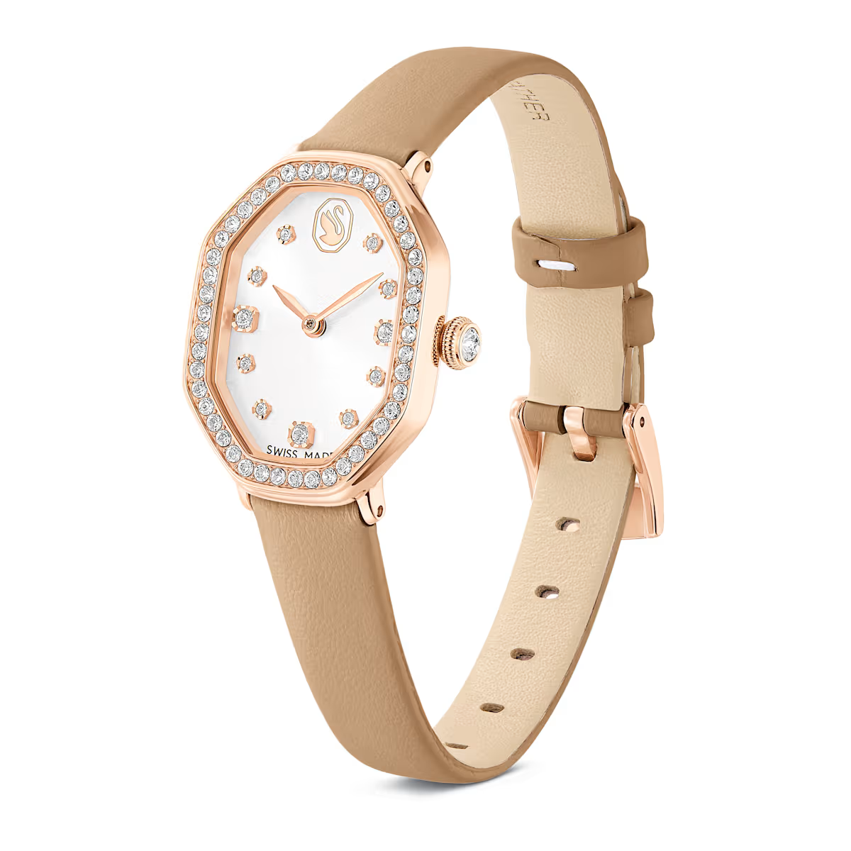 Dextera octagon watch, Swiss Made, Leather strap, Brown, Rose gold-tone finish - Inspired by the timeless elegance of the Dextera family, this 18 x 23 mm watch is uniquely crafted in Swarovski’s iconic octagon shape. Made in stainless steel with a rose gold-tone finish, the design features a pavé bezel set with 46 crystals, and an additional crystal set within the crown. The sunray dial also includes delicate crystal indexes, along with slender hands and a swan logo at 12 o’clock. To complete this radiant creation, the watch is presented on a brown leather strap. This Swiss Made watch is water resistant to 50m.