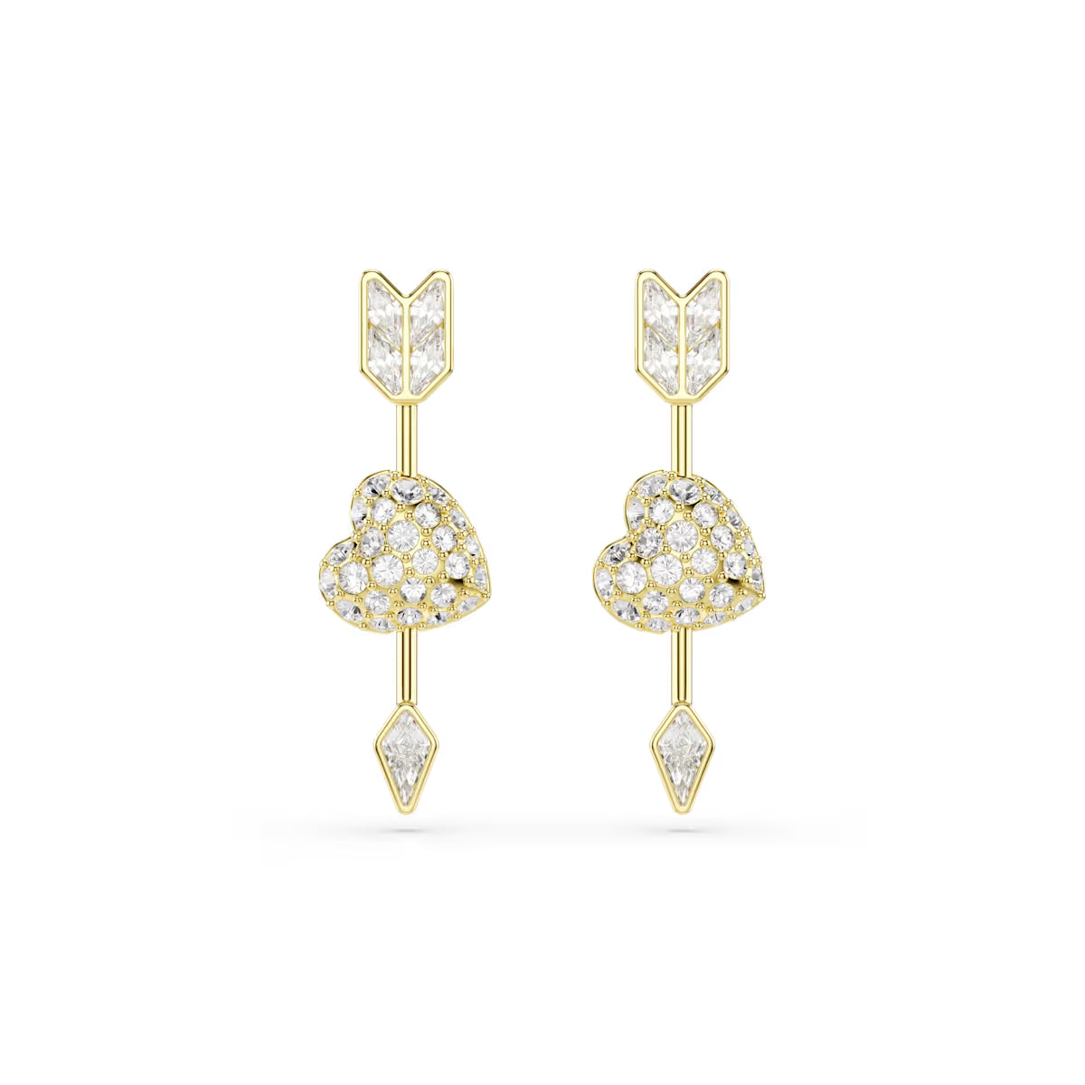 SWAROVSKI IDYLLIA:PE ARROW WHI/GOS - Cupid strikes twice in these expressive Idyllia earrings. Each gold-tone plated piece features a love heart pierced by an arrow, with glittering clear crystals on one side, and a vivid pink color on the other side. Reverse them as often as you like for versatile styling options.