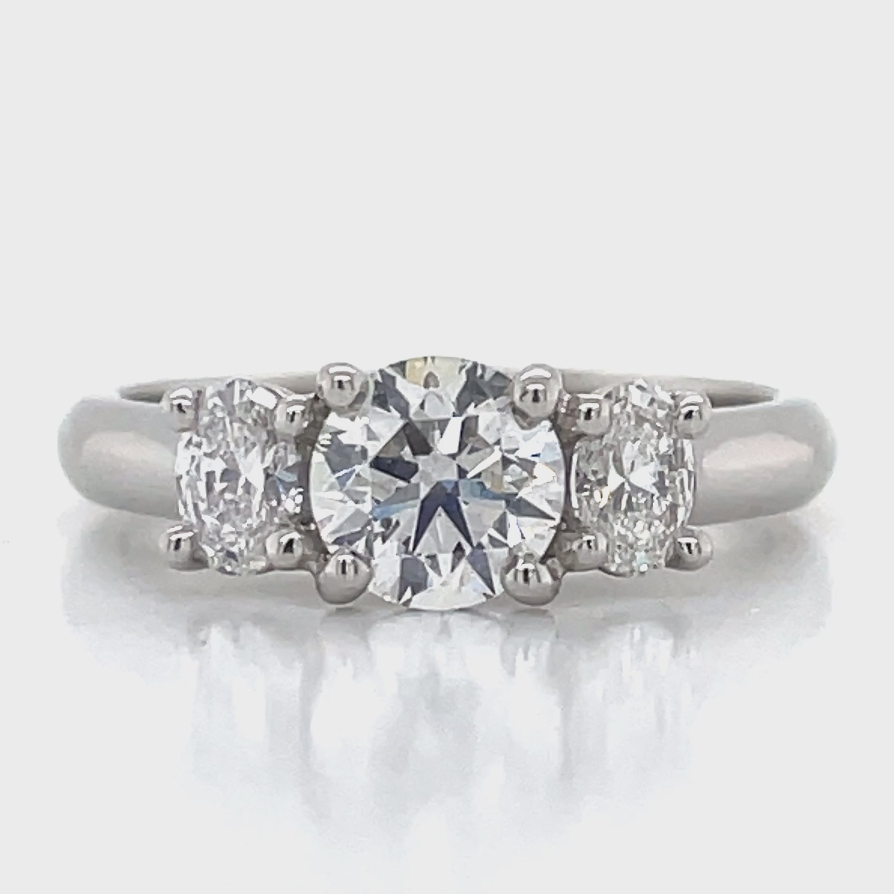 Created in the John Franich Collection - 'Almas' Diamonds are a symbol of love, commitment, and eternity. The round brilliant is an H colour as certified by the GIA. It is accompanied by two oval F VS diamonds of equally excellent quality, all neatly encased in this claw set platinum mount that is designed to accommodate a straight wedding band alongside, a useful design attribute.