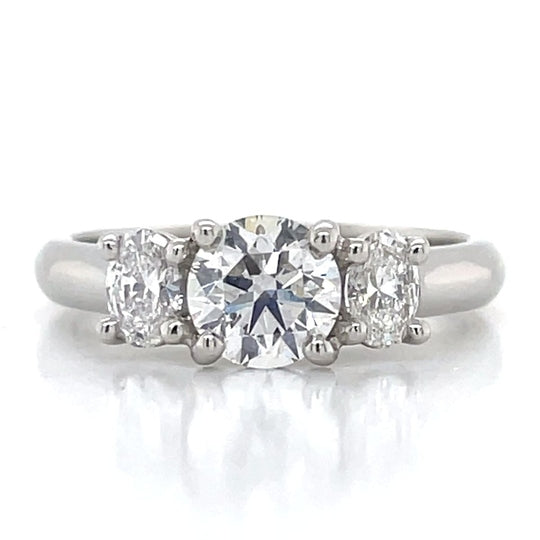 Created in the John Franich Collection - 'Almas' Diamonds are a symbol of love, commitment, and eternity. The round brilliant is an H colour as certified by the GIA. It is accompanied by two oval F VS diamonds of equally excellent quality, all neatly encased in this claw set platinum mount that is designed to accommodate a straight wedding band alongside, a useful design attribute.