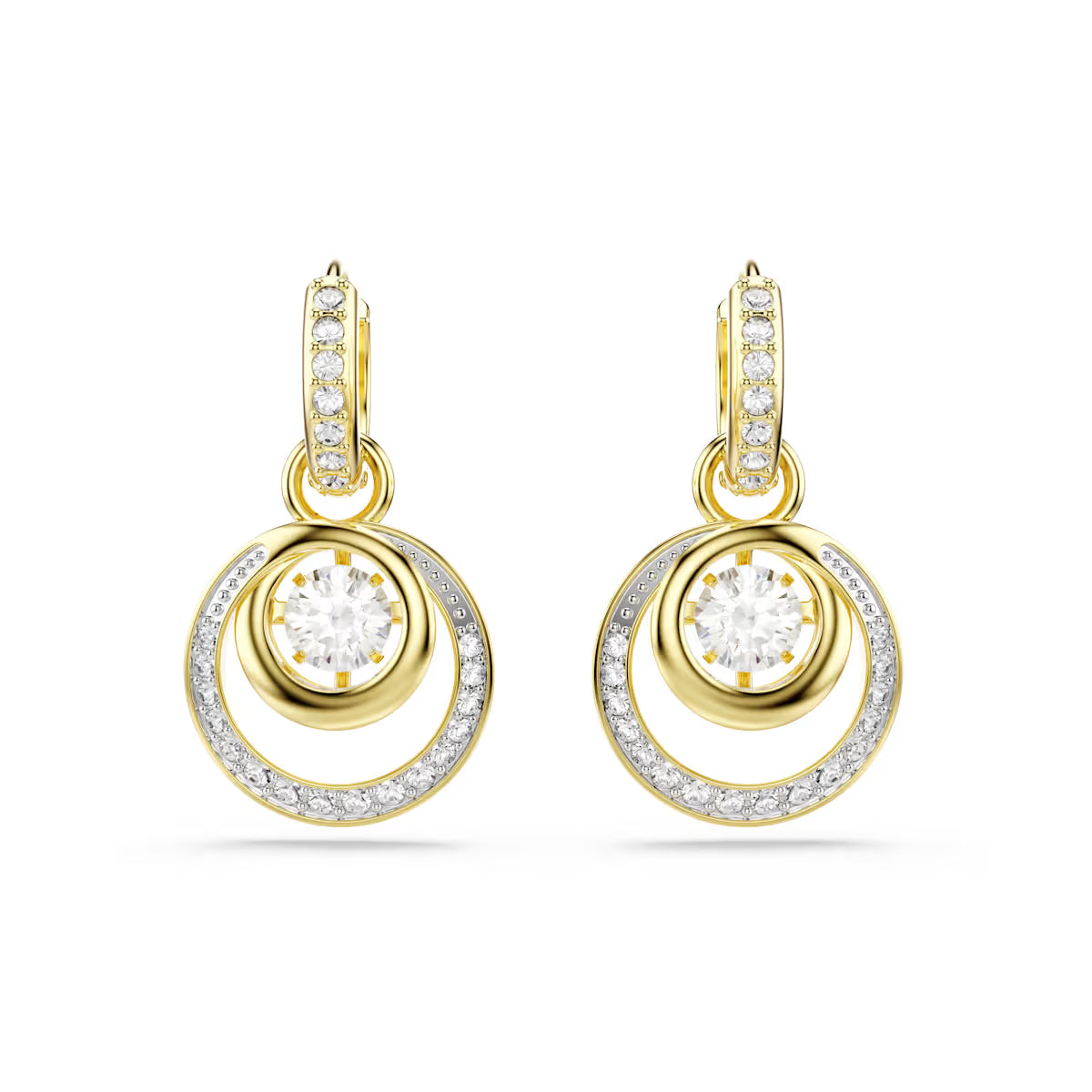 SWAROVSKI HYPERBOLA:PE WHI/GOS - Inject movement into your style with these circular gold-tone plated earrings. Connected to mini pavé hoops, each piece features a central dancing stone surrounded by spirals of crystals in varying sizes. Wear them with a matching necklace or a ring to emphasize the hypnotic look.