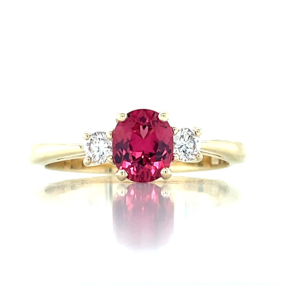 'Scarlet' 9K Yellow Gold 0.84ct Red Spinel & 2=0.20ct Diamonds Ring - Created in the JFJ Private Collection - Discover the allure of this 9K Yellow Gold Ring, featuring a striking 0.84ct Red Spinel at its centre, accented by two round brilliant diamonds.