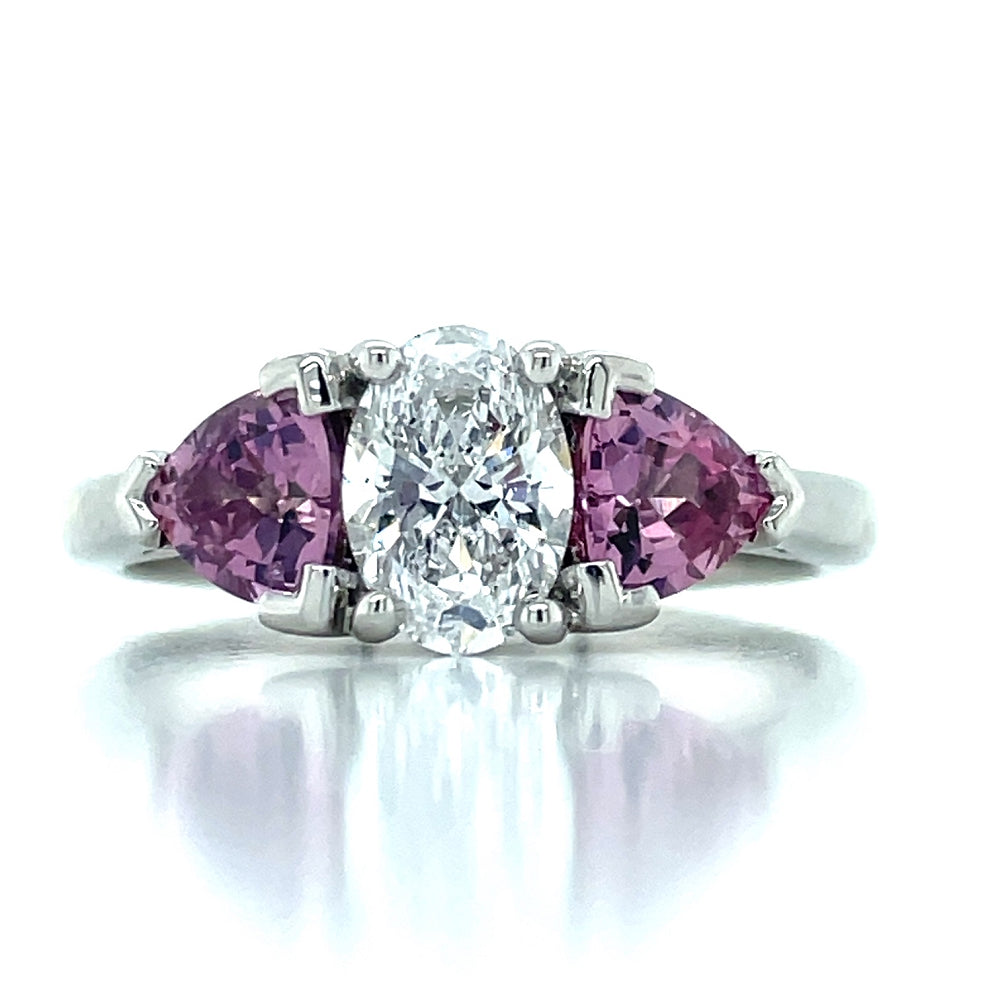'Isabeau' Platinum 0.81ct Oval Diamond & Padparadscha Sapphires Ring