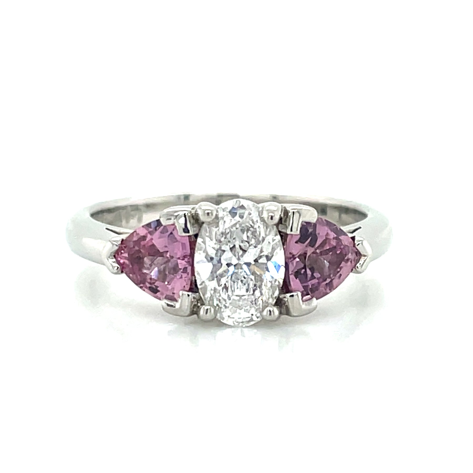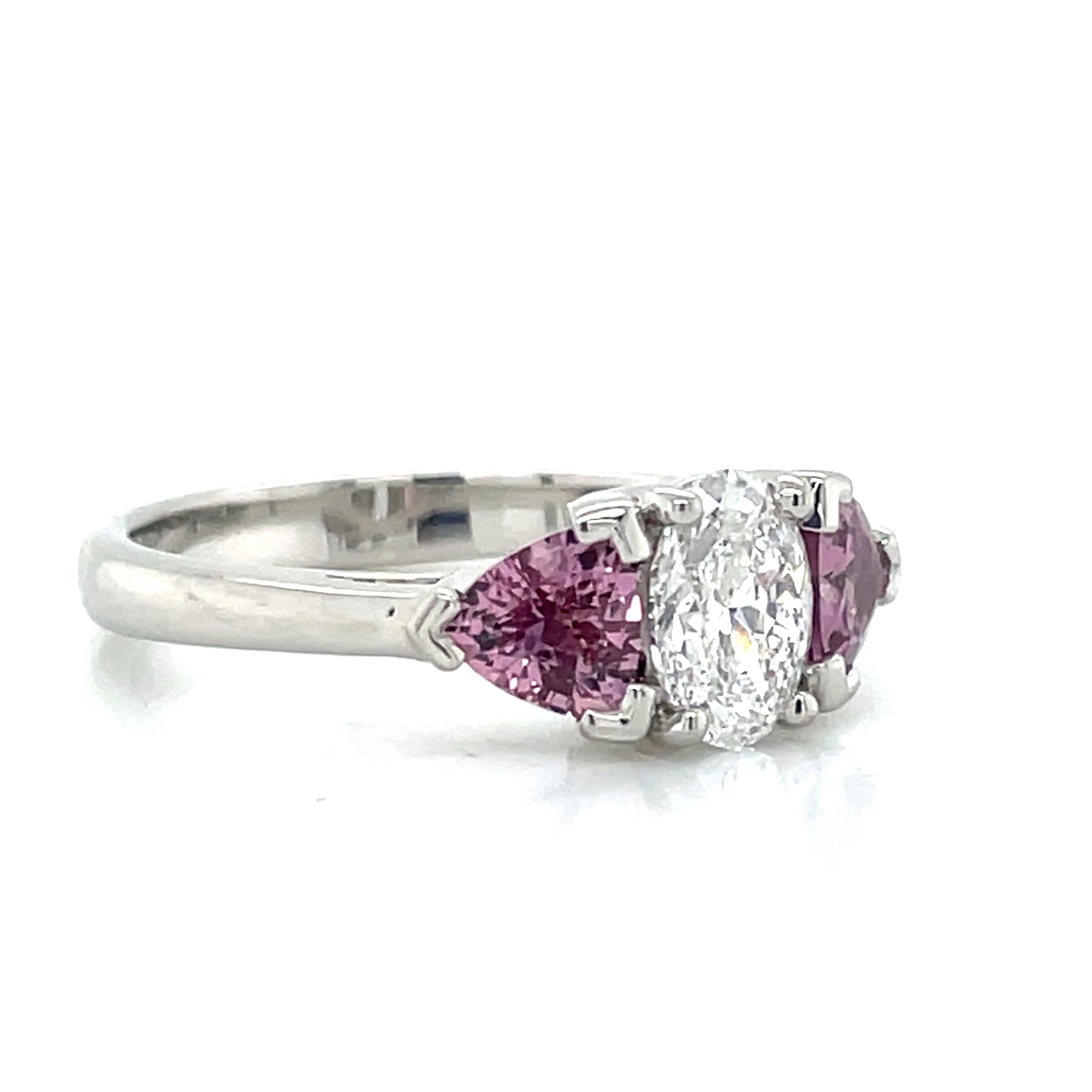 'Isabeau' Platinum 0.81ct Oval Diamond & Padparadscha Sapphires Ring