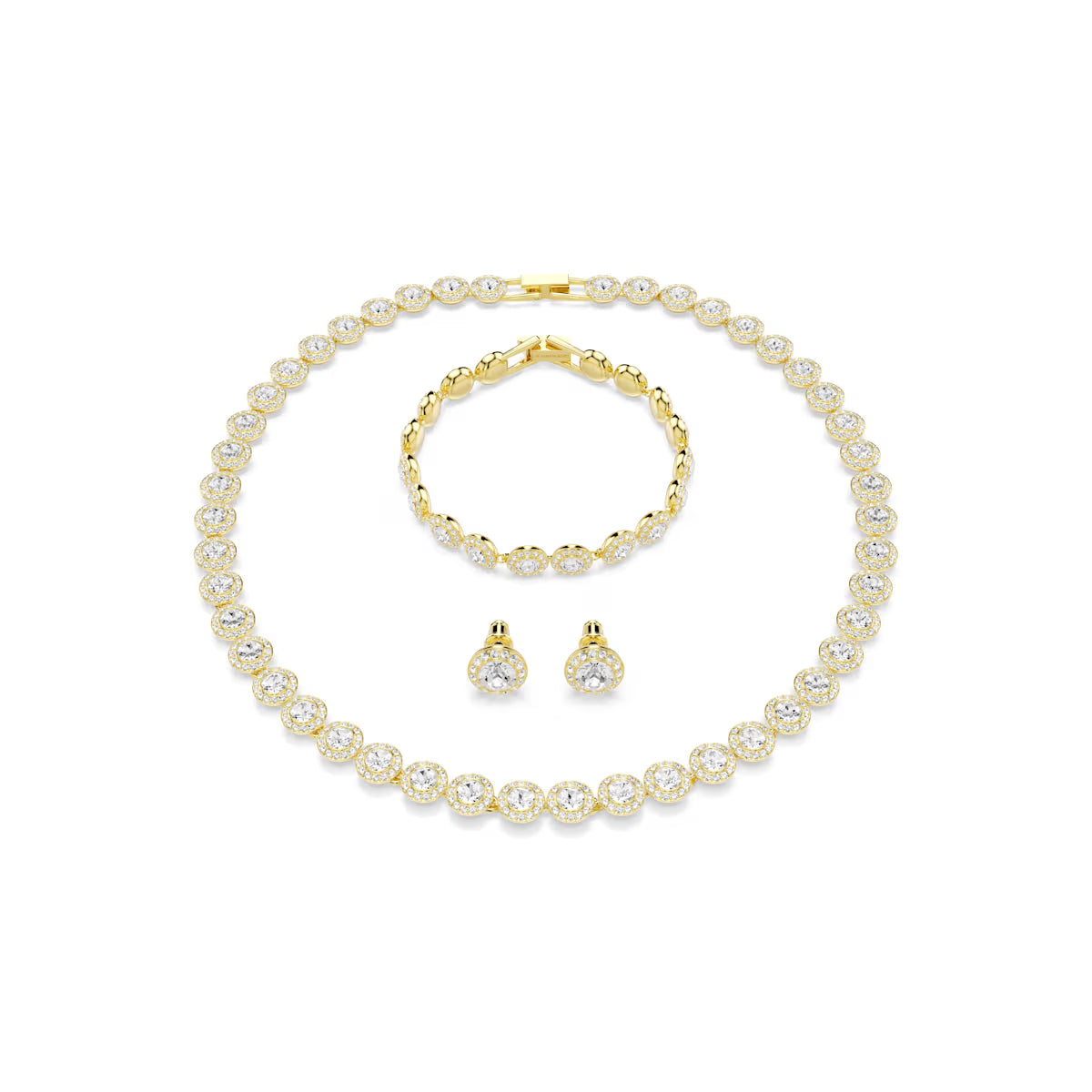 SWAROVSKI UNA:SET ANGELIC CRY/GOS - Treat yourself or someone special to a light-filled jewelry combination with this beautiful necklace, earrings, and bracelet set. The easy-to-wear pieces feature clear crystals in a gold-tone plated setting, offering a timeless design that would make an ideal gift, or a stunning bridal accessory.
