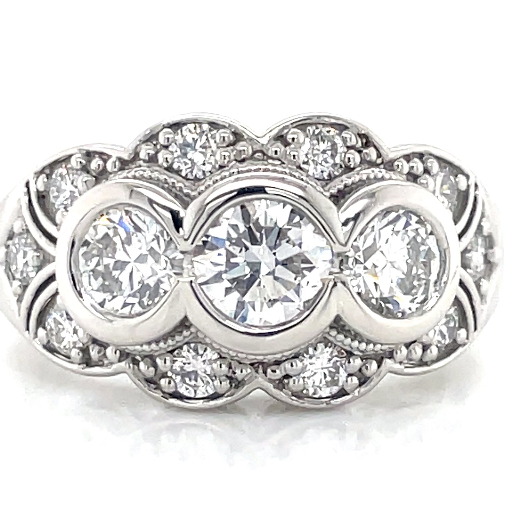 'Donna' Platinum 3st E SI2 Diamond Ring w10=0.40ct FG SI Diamond Accents - Created in the John Franich Collection, the ‘Donna’ Platinum Diamond Ring captures the elegance of the Art Deco era. Set with three dazzling E SI2 diamonds totalling 1.61ct, and enhanced by 10 FG SI diamond accents (0.40ct), this design is both timeless and sophisticated—an heirloom piece to treasure for generations.